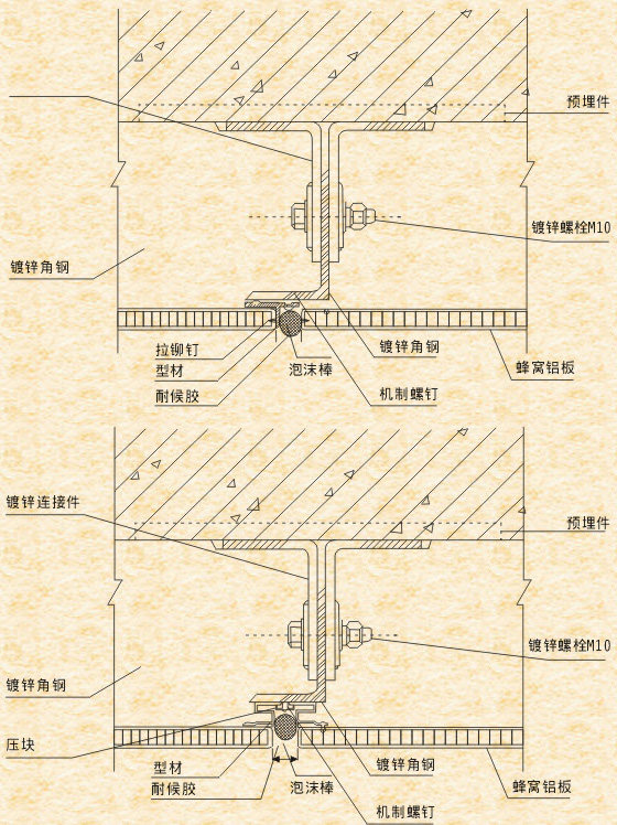 五、鋁蜂窩板幕墻的框架應使用表面經陽極氧化處理的鋁型材,不可使用鋼型材。因框架與壁板若是2種不同的金屬,容易產生電極電位差,使鋁板受到腐蝕。高層建筑鋁蜂窩板幕墻框架使用的鋁型材厚度不得小于3mm。安裝壁板時要使用不銹鋼螺絲或鍍鋅螺絲,不能使用普通螺絲。框架系統的每根豎料應與主體結構的預埋減牢固連接,橫料與豎料間再以不銹鋼螺栓固定,保證安裝后耐久性。